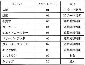 ある遊園地では、ICカードを利用した精算システムを導入した。入園児に、入園者から入園料を受け取ると、入園者番号を記録したICカードを渡し、入園者番号と年齢層の情報を入園者ファイルに格納する。各施設では、提示されたICカードから入園者番号を読み取り、施設利用実績をイベントファイルに格納する。退園時に、入園者からICカードが返却されたときに、施設利用料金を一括で徴収する。